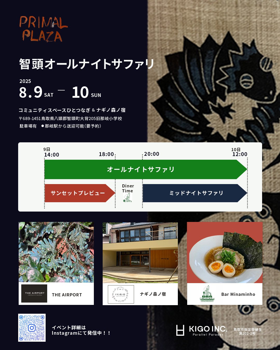 記号株式会社(代表取締役:島田 晋輔)が運営するTHE AIRPORTは、2025年8月9日(土)から8月10日(日)にかけて、鳥取県智頭町の旧那岐小学校2階「ひとつなぎ」にて、オールナイトの体験型イベント「PRIMAL PLAZA〜智頭オールナイトサファリ」を開催します。