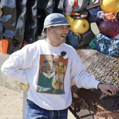 柴田英昭(しばたひであき)。1976年岡山県生まれ。アーティスト名は淀川テクニック。2003年より大阪・淀川の河川敷を拠点に活動を開始。ゴミや漂流物、廃棄物などを素材に、土地ごとの風景や人々との交流を取り込みながら造形作品を制作してきた。岡山県・宇野港に常設展示された「宇野のチヌ」は特によく知られている。国内外で滞在制作や展覧会を行いながら、ゴミという素材を通して人と土地、環境との関係を問い続けている。