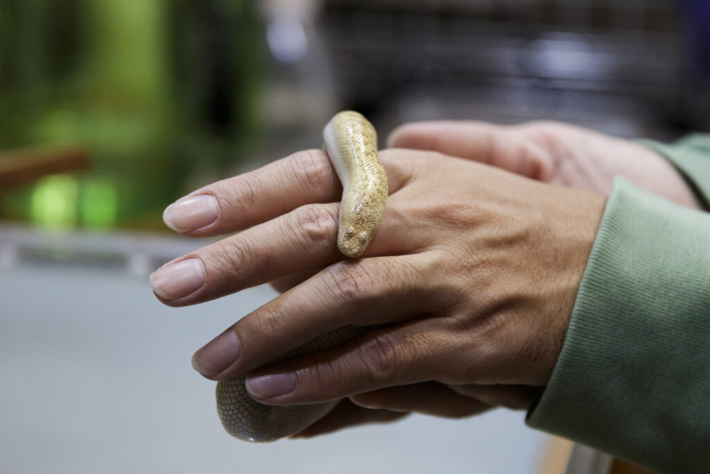 最初の5年は、ヒョウモントカゲモドキとヤモリだけの期間が、割と長かったです。その後に初めてジョニーサンドボアというヘビのメスを飼いました。やっぱり、ヒョウモントカゲモドキを殖やした経験があるから、ヘビも殖やしてみたくなるんですよね。オスを、車庫に置いていたら冷やしすぎてしまい死んでしまいました。でも、メスは生きとったんです。1年後か2年後かにまたオスを見つけて、やっとペアが揃ったところから、7年くらいで繁殖しました。